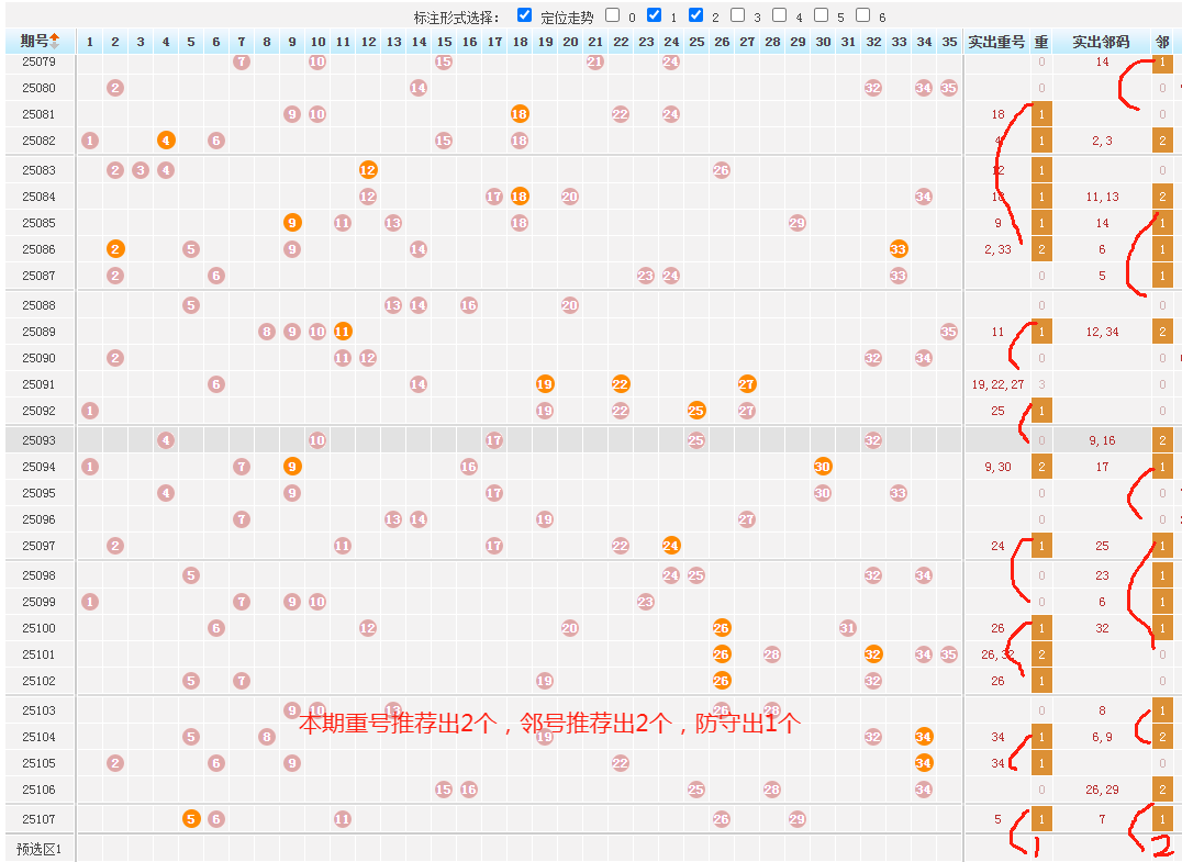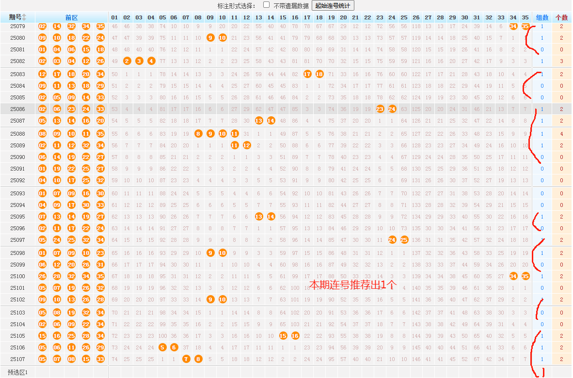 1、前区重号走势:上期前区开出1个重复奖号,近105期出号个数为:0-0-0-1-0-1-0-1-0-0-0-3-0-0-1-1-1-1-1-1-1-0-0-0-0-0-1-1-1-2-0-1-1-1-0-1-2-1-1-1-1-0-0-0-1-1-1-0-1-0-0-2-0-3-2-1-1-1-2-1-1-0-0-1-1-2-0-0-0-1-1-0-1-0-1-0-0-0-0-0-0-0-1-1-1-1-1-2-0-0-1-0-3-1-0-2-0-0-1-0-0-1-2-1-0-1-1-0-1,根据出号规律,01101后紧随0-2-0-1-1-1-0-0-01-0-1-0-1-0-1-1-0-0-,本期推荐出1个,防守出2个,近期重号个数下降,本期推荐重号走热,防出1-2个重号。