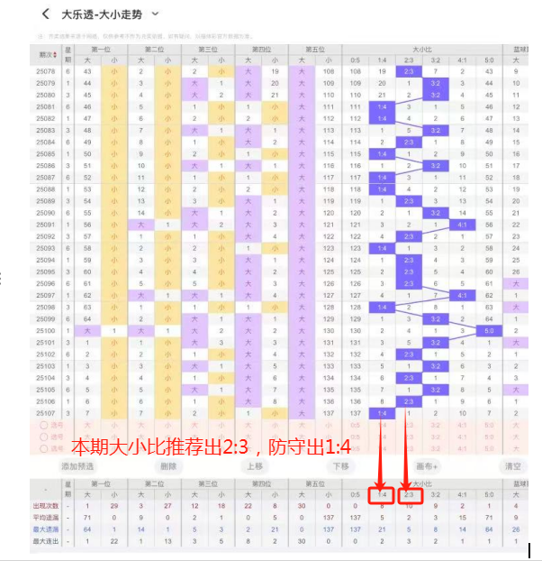 6、大小比:上期开出大小比为1:4,近65期开出4:1出现18次,3:2出现25次,2:3出现39次,1:4出现23次,5:0出现3次,本期推荐出2:3,防守出1:4,本期重点推荐出2:3。