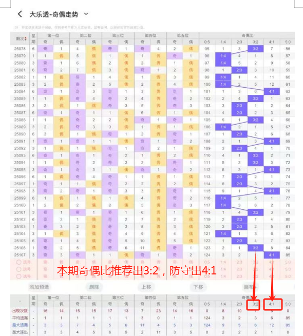 4、奇偶比:上期开出4个奇数为:05 07 15 33,出偶数1个:08,一般开出奇数期数较长,奇偶比为4:1,近85期奇偶比224:234,整体看偶数走势上升,本期重点看奇数强势,本期推荐出3:2,防守出4:1,本期重点关注3:2。