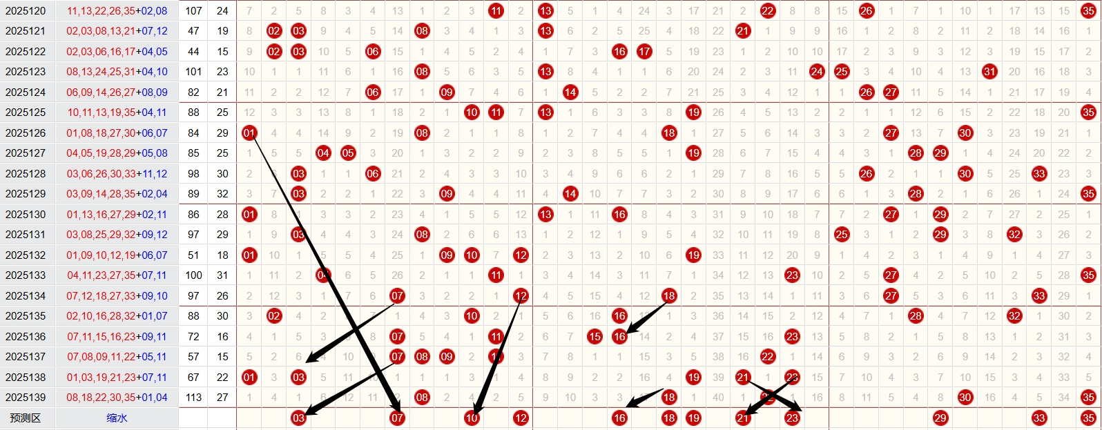 回顾上期25139期开奖08 18 22 30 35 + 01 04,其中一小区01-12出1个,二小区13-24出2个号,三小区25-35出2个!