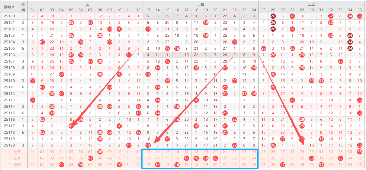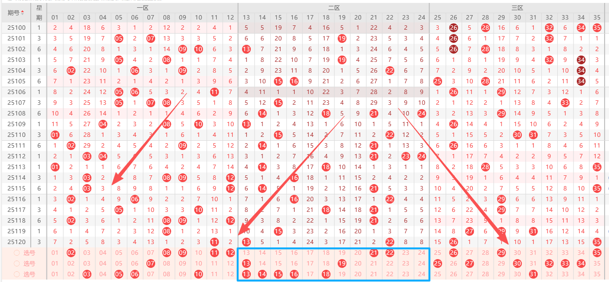 第三区:本期的凤尾,可以考虑31和33,35几个号码,3区号需要考虑27和30这几个号码。