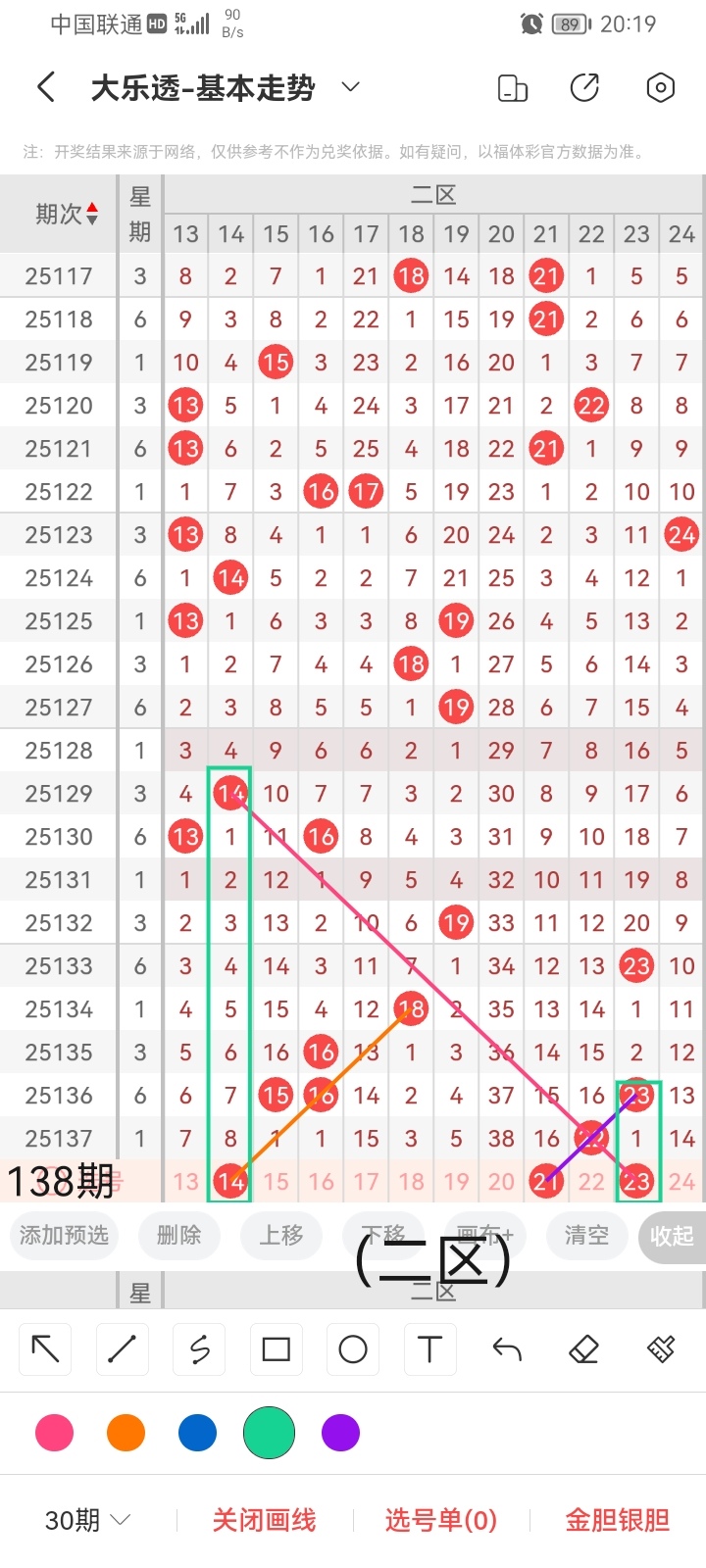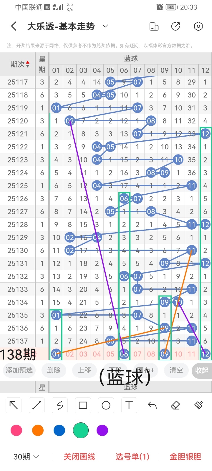通过以上对上期的简单回顾,下面进入大乐透第2025138期(下面简称本期)的选号分析: