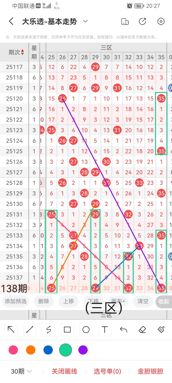 小梁根据图中画线思路,最后给大家汇总提供一下大乐透本期红球、蓝球数据,供大家参考: