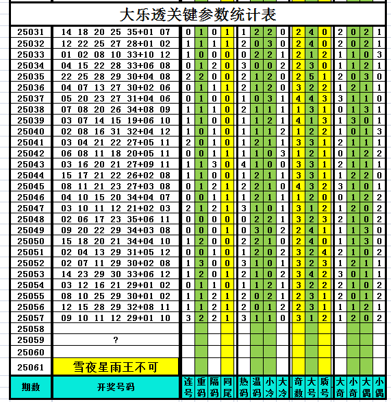 以下是作者手工统计的大乐透关键参数统计表,对喜欢参数分析、过滤缩水、选号胆杀的技术性大乐透爱好者有所帮助,其它读者可略过不看。