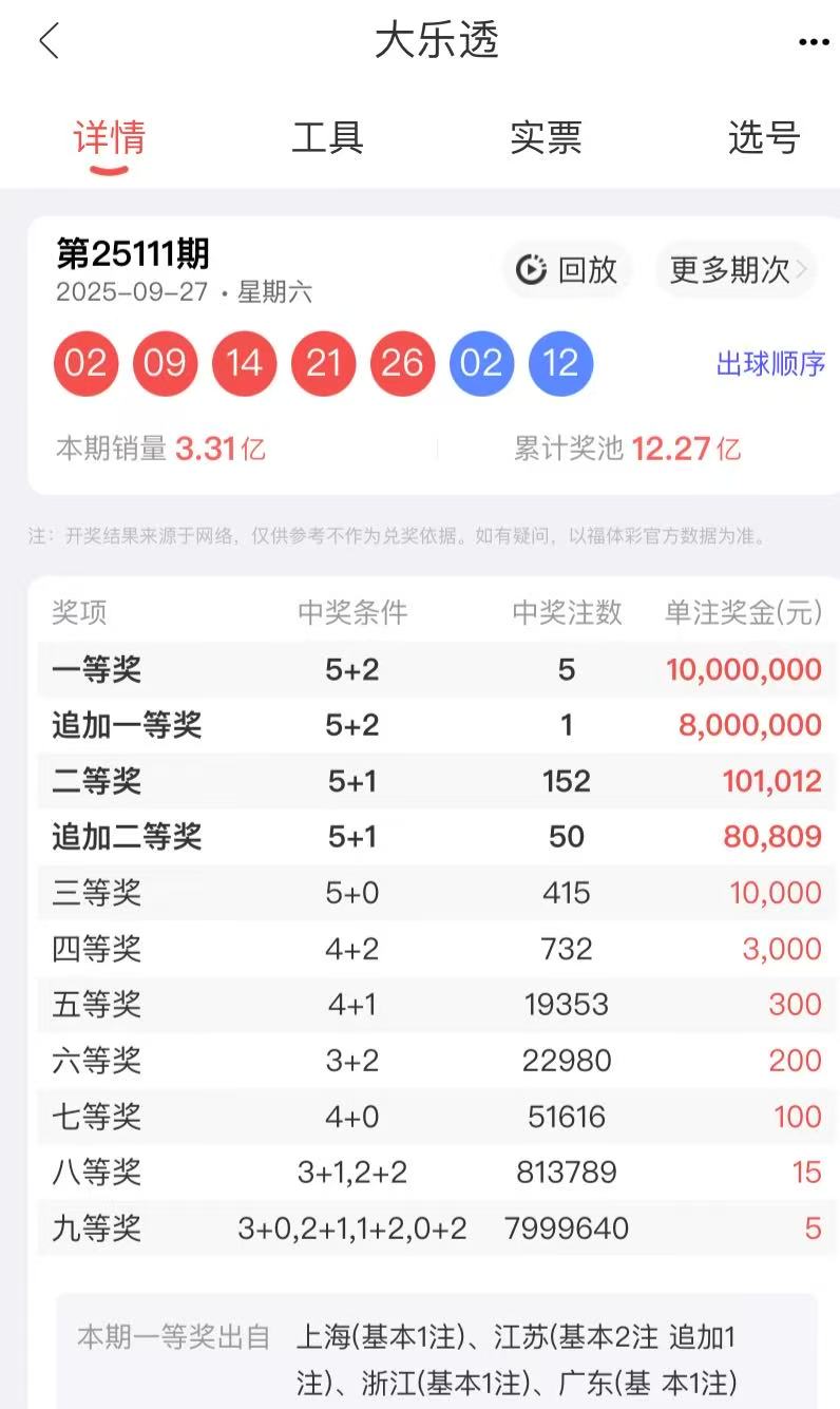 前区奖号开出0个重号,连号开出0个,奇偶比为2:3,和值为72,跨度为24,三个区的区间比为2:2:1,后区号码开出偶偶02 12,开出1个重号,出1个大号。