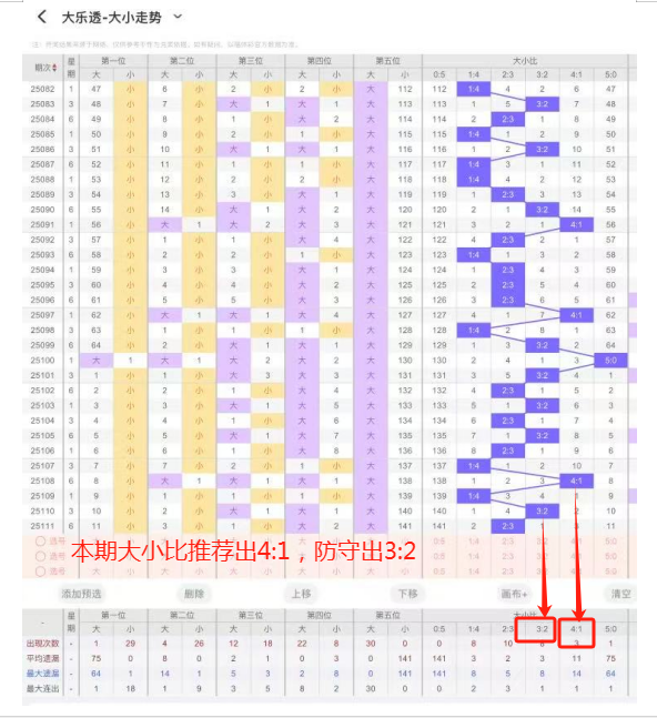 6、大小比:上期开出大小比为2:3,近69期开出4:1出现19次,3:2出现26次,2:3出现40次,1:4出现24次。5:0出现3次,本期推荐出4:1,防守出3:2,本期重点推荐出3:2。