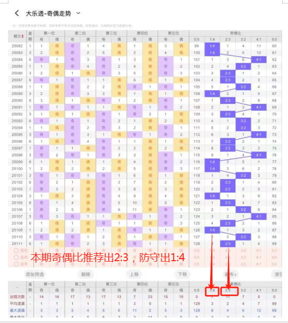 4、奇偶比:上期开出2个奇数为 09 21,出偶数3个尾02 14 26,一般开出奇数期数较长,奇偶比为2:3,近89期奇偶比为232:246,整体看偶数走势上升,本期重点看偶数强势,本期推荐出2:3,防守出1:4,本期重点关注2:3。