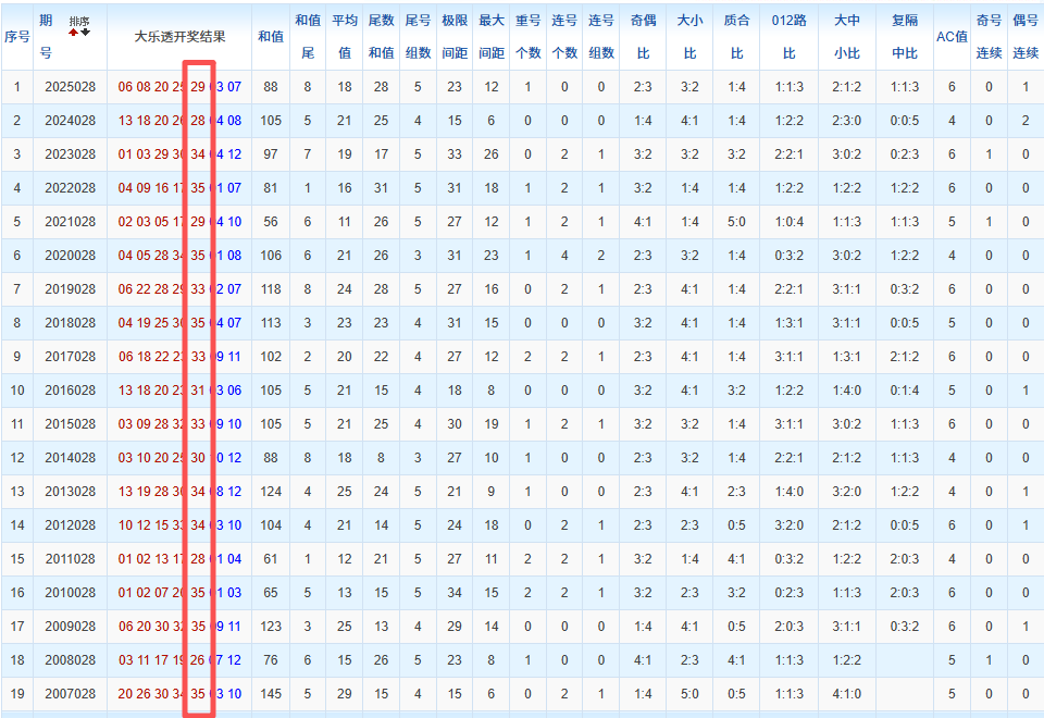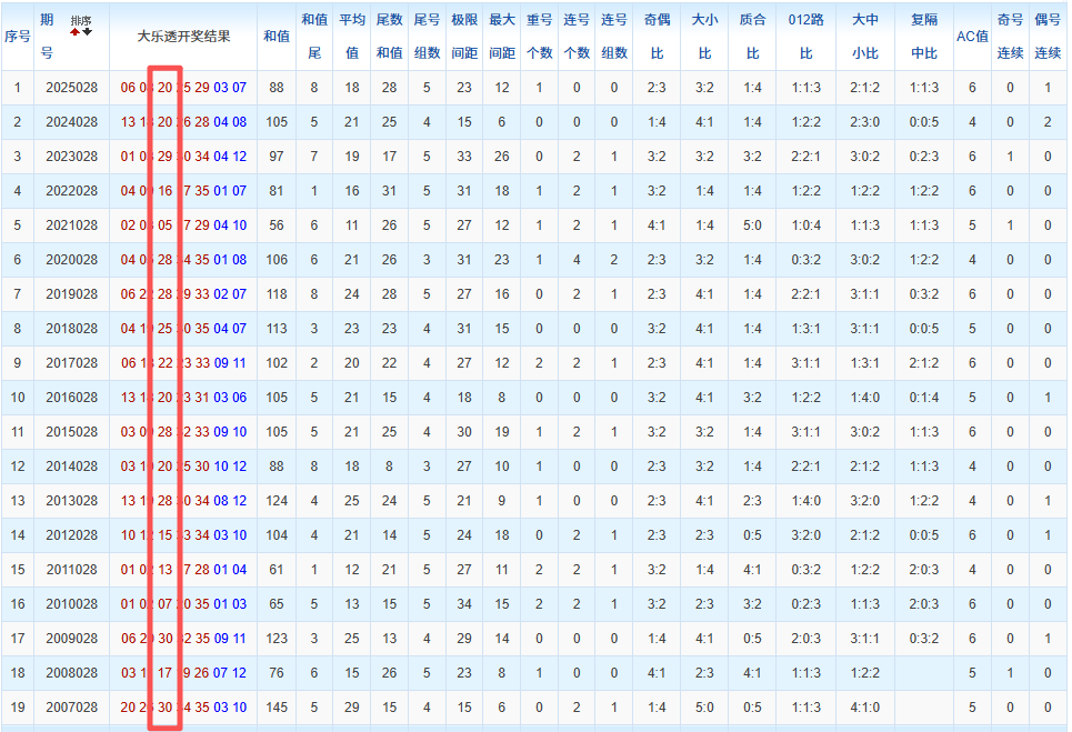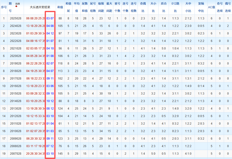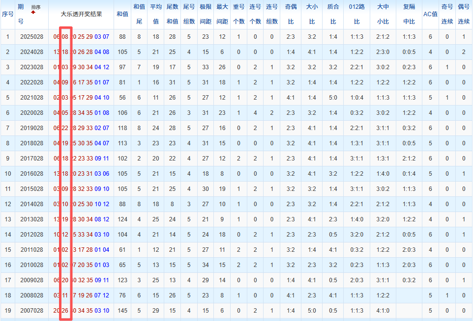 通过观察,我发现往年同期的开奖数据与本期号码之间存在显著关联。具体来说,在前区号码中,从第一位至第五位,通常会有约三个位置上的数字与往年同期相同位置的号码一致;而后区号码中,也有多期开奖结果直接包含了往年同期的数字。因此,我们可以借助往年同期各位置上的号码,作为分析本期开奖情况的重要依据。在此基础上,还可结合往年同期的其他相关条件,进行综合性的号码组合推荐。