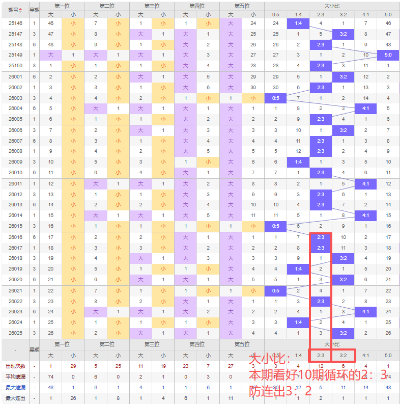 上期大小比:3:2,近10期大小比出现情况:2:3、2:3、3:2、1:4、3:2、0:5、2:3、4:1、1:4、3:2,最近10期出现3期3:2,出现3期2:3,出现1期4:1,出现2期1:4,出现0期5:0,出现1期0:5,根据近10期规律本期看好10奇循环出2:3,防连出3:2,综上所述推荐大小比推荐:3:2,重点关注:2:3。