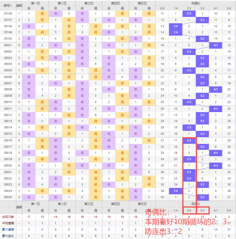 上期奇偶比:3:2,近10期奇偶比出现情况:2:3、3:2、4:1、2:3、4:1、2:3、2:3、3:2、1:4、3:2,最近10期出现3期3:2,出现4期2:3,出现2期4:1,出现1期1:4,出现0期5:0,出现0期0:5,根据近10期规律本期看好10期循环的2:3,防连出3:2,综上所述推荐奇偶比推荐:3:2,重点关注:2:3。