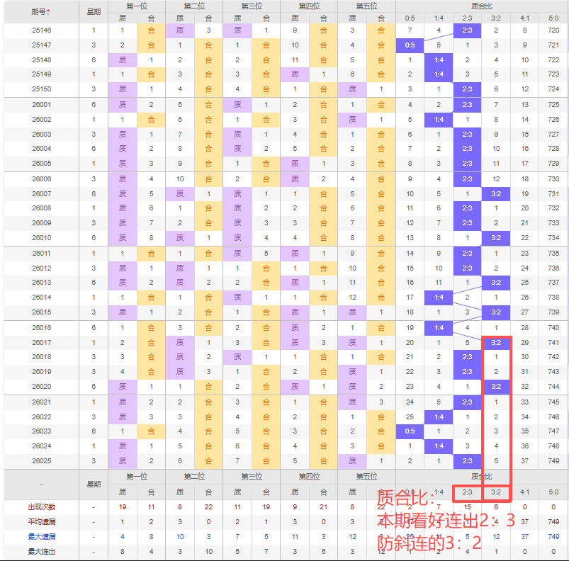 上期质合比:2:3,近10期质合比出现情况:3:2、1:4、3:2、2:3、2:3、3:2、2:3、1:4、0:5、1:4、2:3,最近10期出现2期3:2,出现4期2:3,出现0期4:1,出现3期1:4,出现0期5:0,出现1期0:5,根据近10期规律本期看好连的2:3,防斜连出3:2,综上所述推荐质合比推荐:3:2,重点关注:2:3。