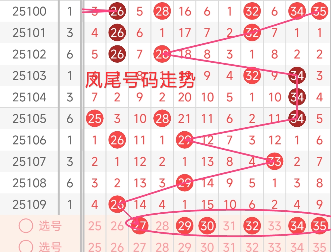 红球三区推荐(25~35):上期红三区开出1枚号码,号码为26,本期红三区建议出号1-3枚,本期红三区推荐关注号27、29、30、34、35。