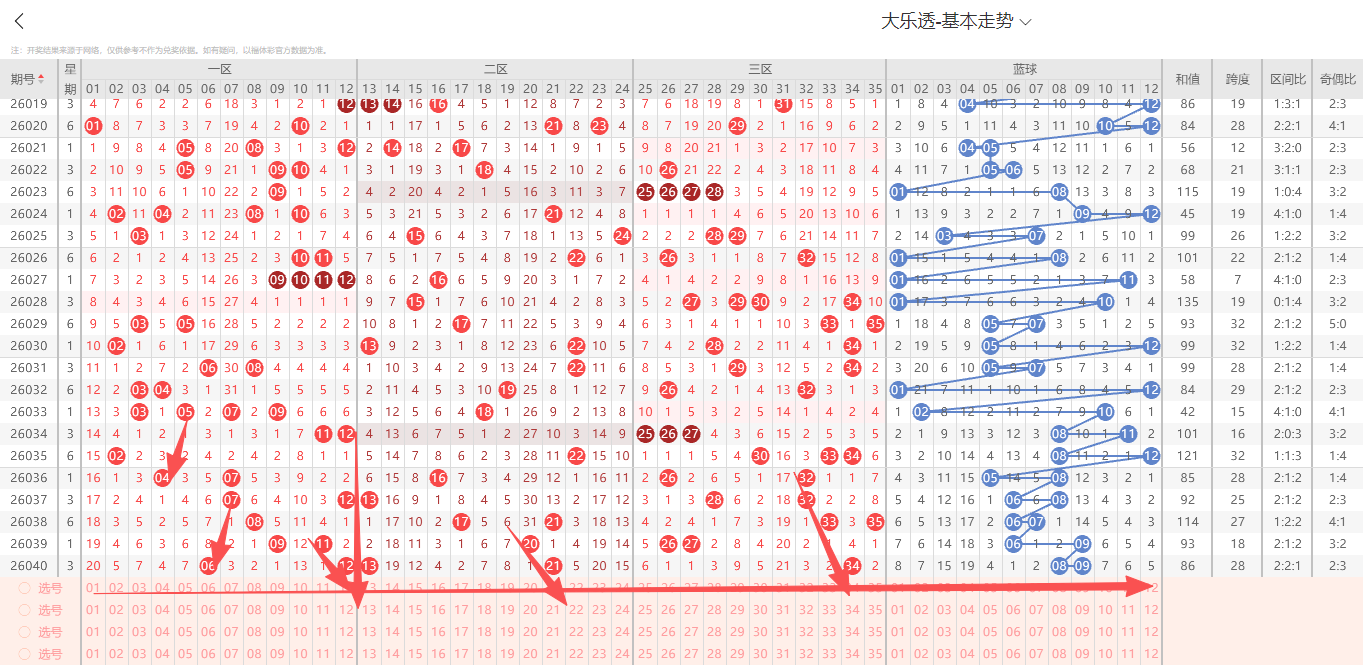 1、前区特征分析:(通过整体走势不难看出每期开奖号都具备以下明显的特征点)
