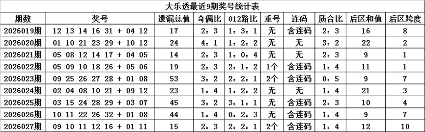 后区跨度:后区近9期跨度分别开出8-2-1-1-7-3-4-7-10,跨度奇偶比为5:4,上期跨度上升3个点位,本期防跨度转向下降,看好开出偶数跨度,参考跨度6。