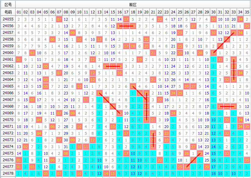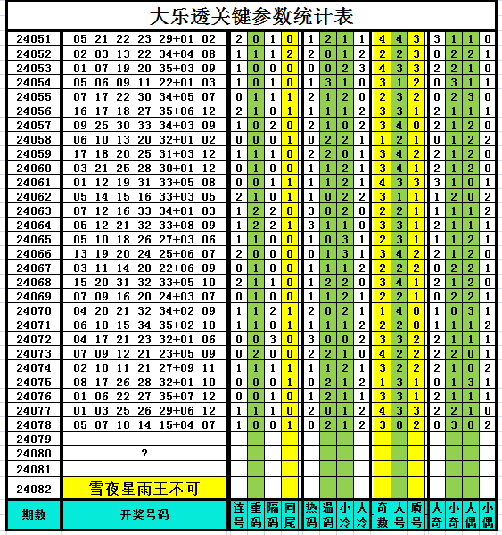 上期热、温、小、大冷为0212组合形态,追踪数据请参考大乐透关键参数统计表。