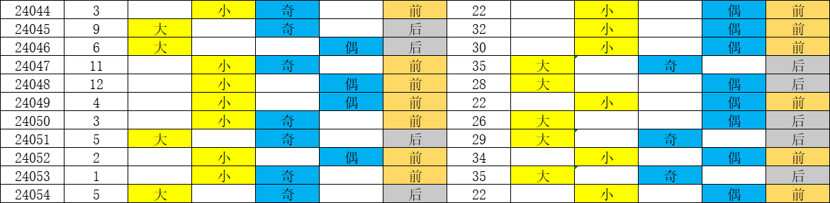 尾数5/大小比1:4/奇偶比32/重号0/连号1/邻号1/隔期号1/跨度17/和值53/区间比410