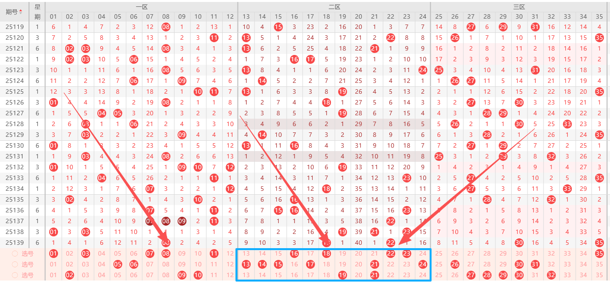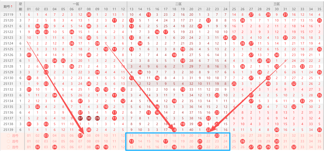 第二区:第二区号码里面,本期看好的号码有13,17和18,另外防21和23这几个号码;