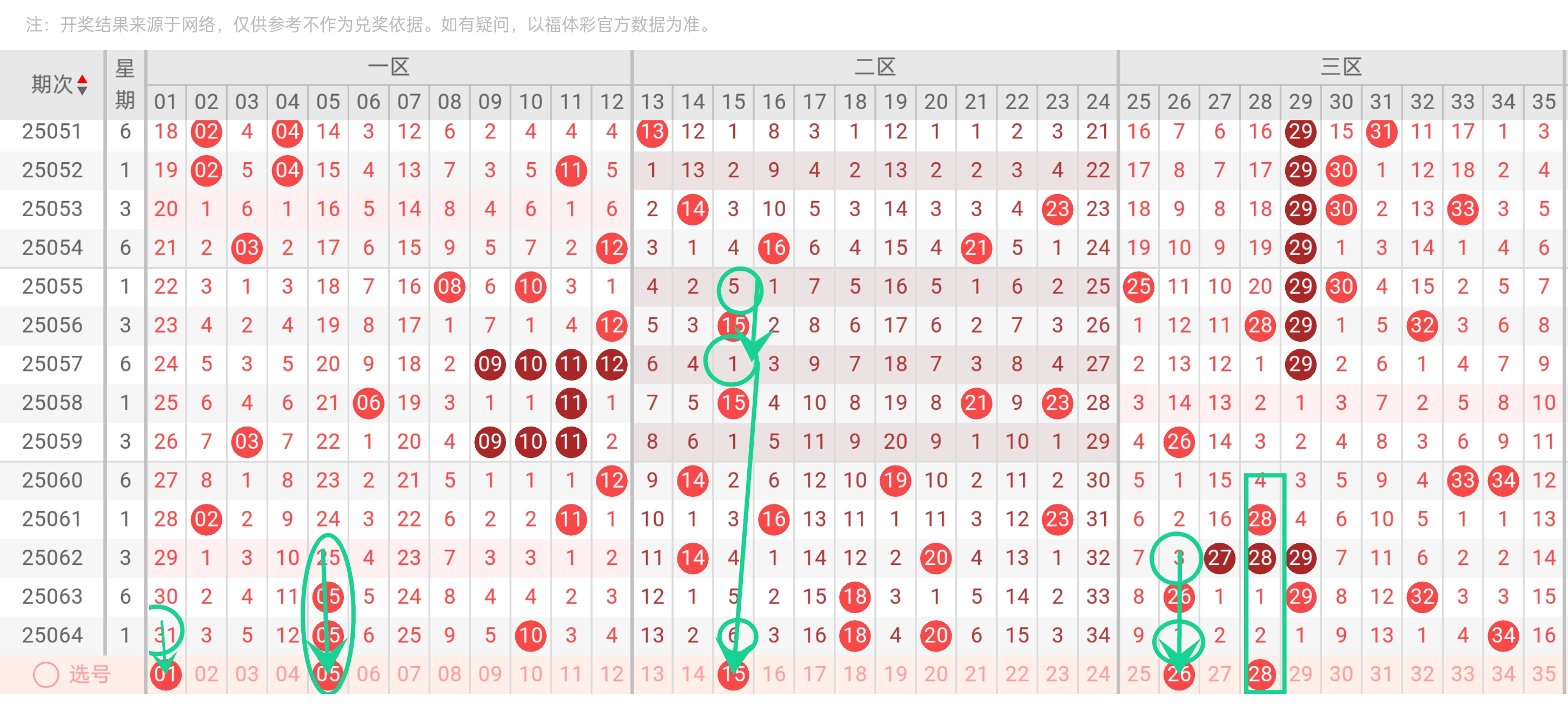 | 冷号 | 01, 34, 35         | 遗漏≥18期(01遗漏25期)|