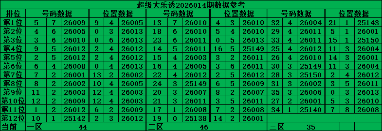 超级大乐透前区是从01-35的号码中每期开出5个号码,以当前最大遗漏期数做为统计数据,把历史数据按照号码分区后分成三个区,一区01-12号,二区13-24号,三区25-35号