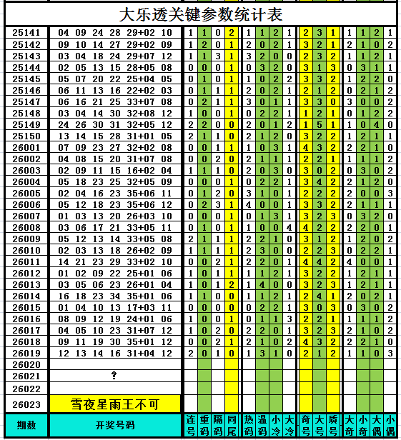 以下是作者手工统计的大乐透关键参数统计表,对喜欢参数分析、过滤缩水、选号胆杀的技术性大乐透爱好者有所帮助,其它读者可略过不看。