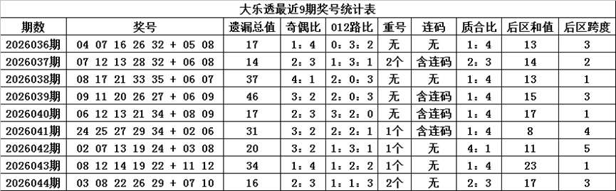 后区跨度:后区近9期跨度分别开出3-2-1-3-1-4-5-1-3,跨度奇偶比为7:2,上期跨度上升2个点位,本期防跨度转向下降,看好开出偶数跨度,参考跨度2。