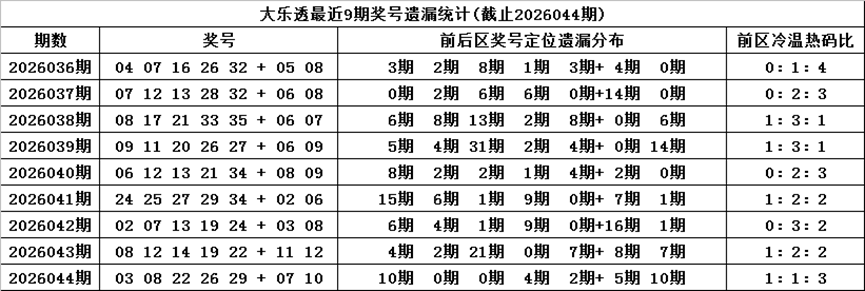 体彩大乐透第2026044期奖号为:03 08 22 26 29 + 07 10,各位号码遗漏期数分别为:10期、0期、0期、4期、2期+5期、10期,前区号码遗漏总期数为16期,012路比为1:1:3,奇偶比为2:3,包含2个重复号码:08、22。后区号码遗漏总期数为15期,和值为17,跨度为3。
