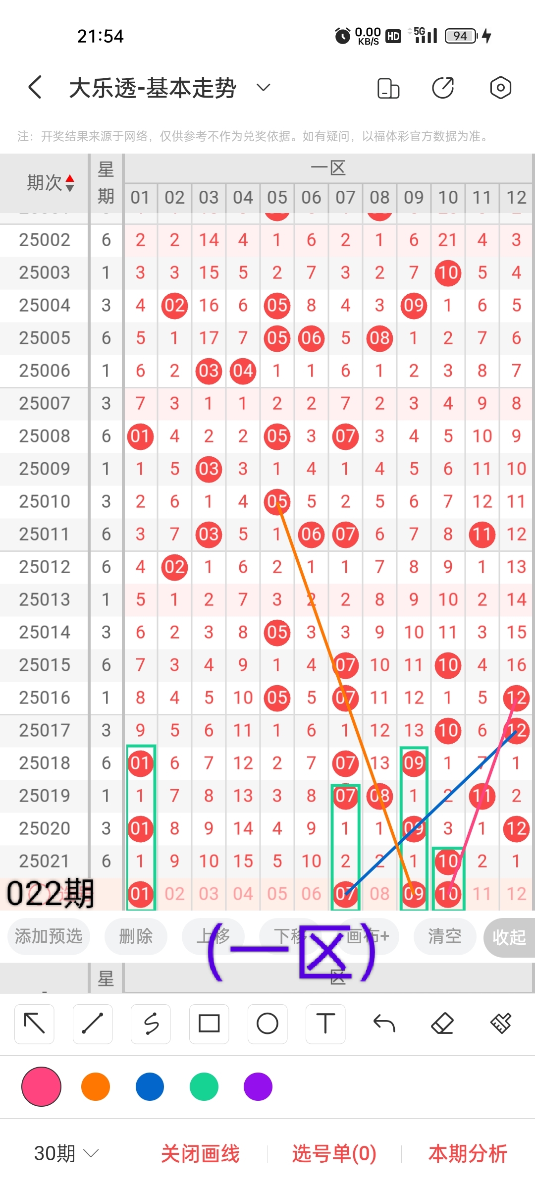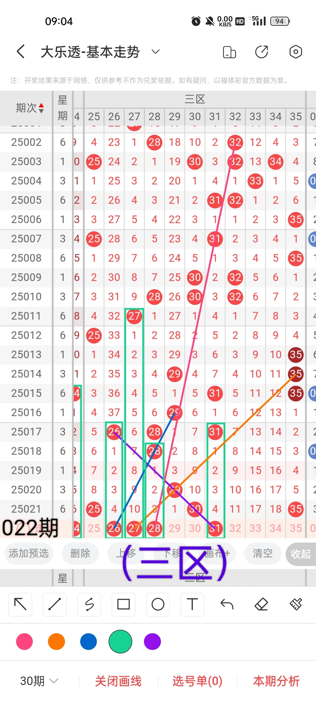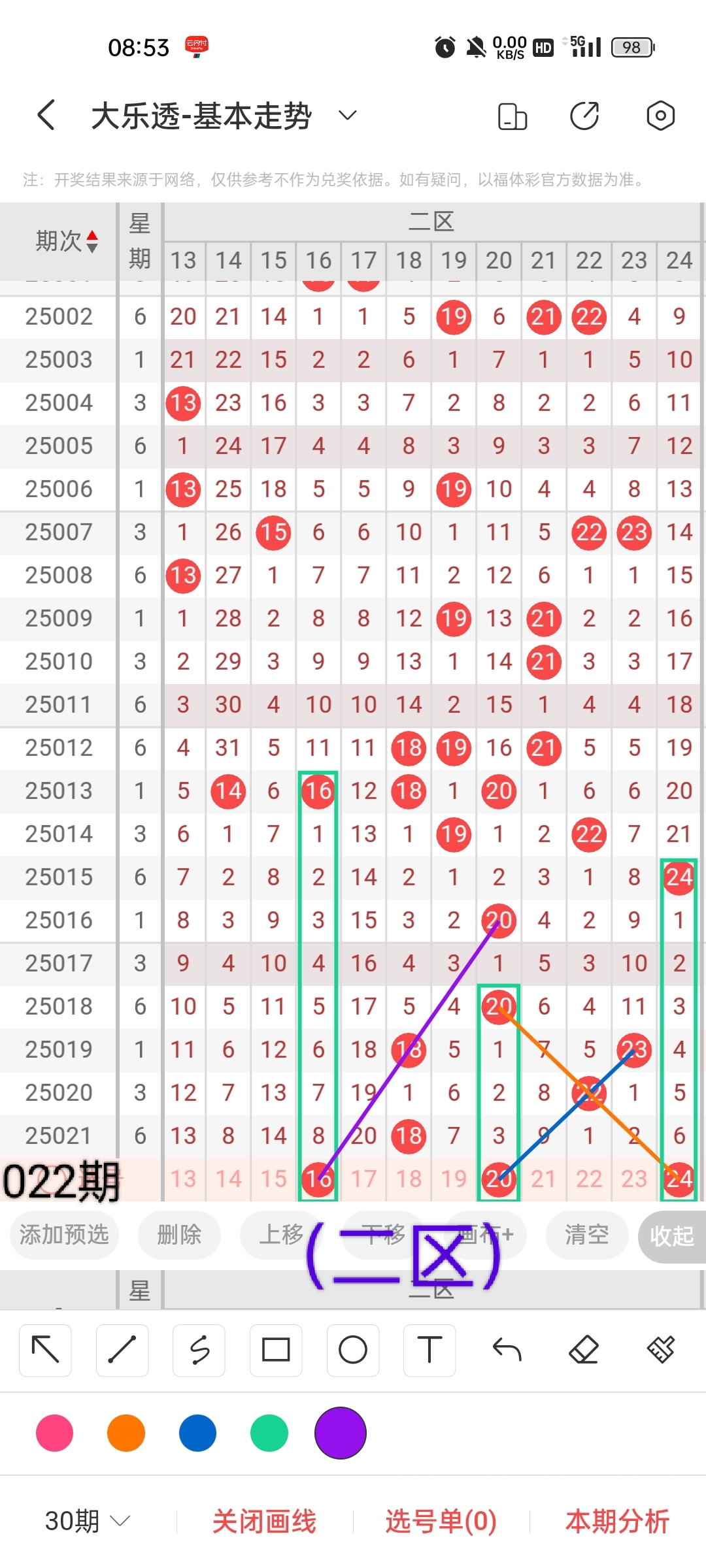 通过以上对上期的简单回顾,下面进入大乐透第2025022期(下面简称本期)的选号分析: