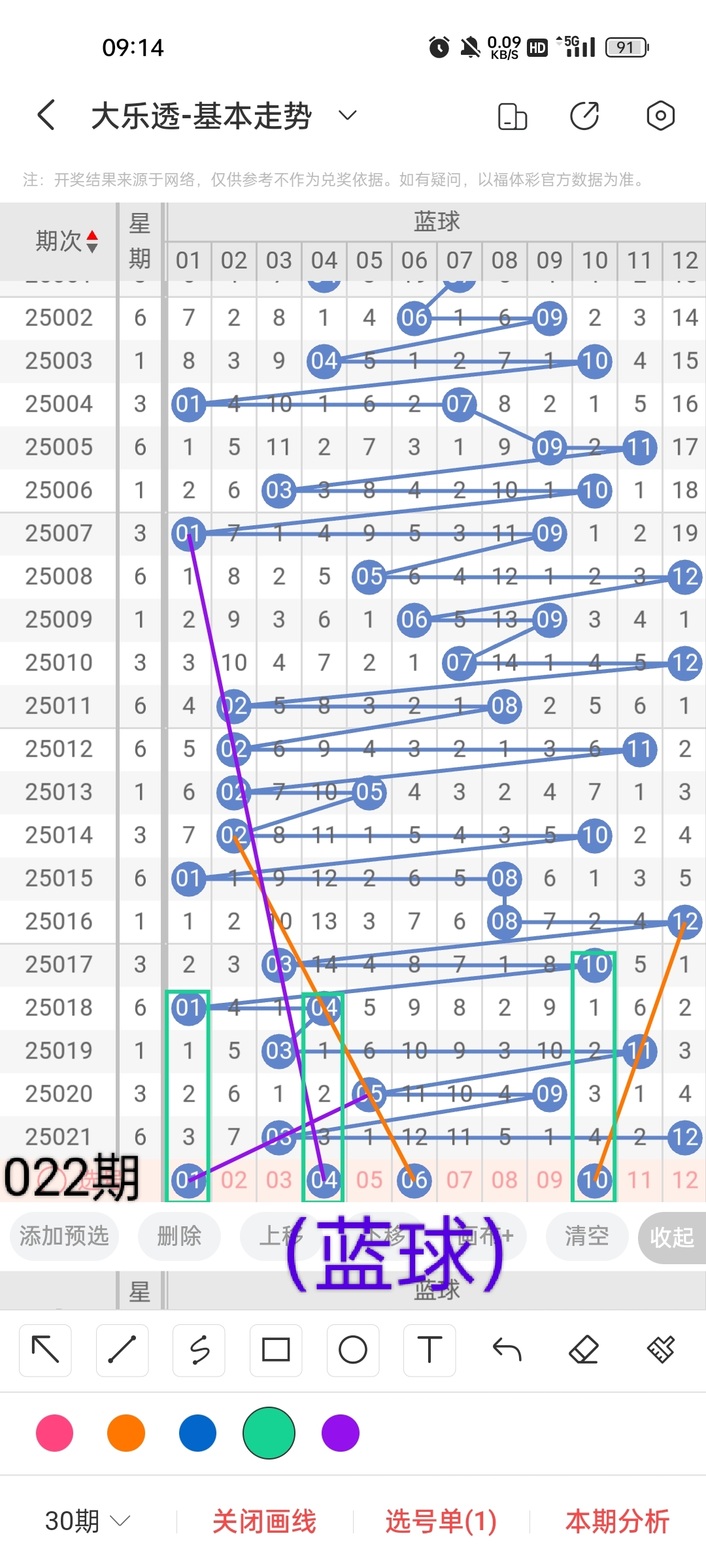 小梁根据图中画线思路,最后给大家汇总提供一下大乐透本期红球、蓝球数据,供大家参考: