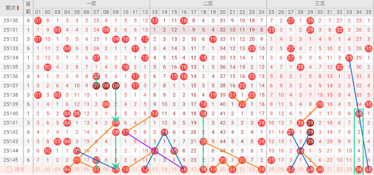三区(25-35)分析:上期该区开出号码25,近10期占比20%,与上期相比-2%。本期无三斜连号趋势,隔码斜连走势:27 29 35。该区间走势清晰地呈现出脉冲—休整的交替节奏。目前正处于连续三期1码的休整状态。连续多期1码后,从概率和能量蓄积角度看,本期强力反弹至2码的概率远高于维持1码。但不排除继续开出1码~。上期仅开出25,而该区~。本期~,关注~,搭配~。推荐关注号码:27、29、30、34、35。