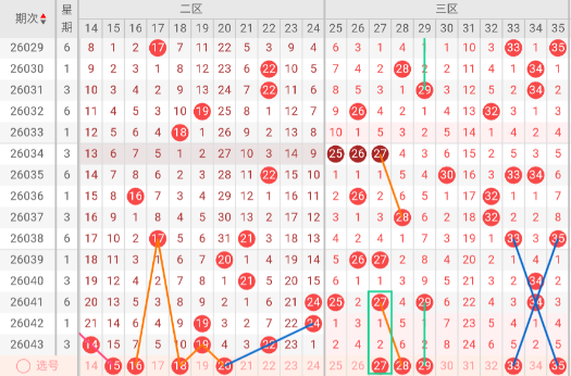 该区间经历了4码爆发后连续两期断区,能量真空明显。根据历史统计,三区连断2期后,下期回补1-2码的概率超过85%。当前热号以及冷号均有大量遗漏,斜连与连号是主要关注方向。推荐关注号码:27、28、29、33、35。