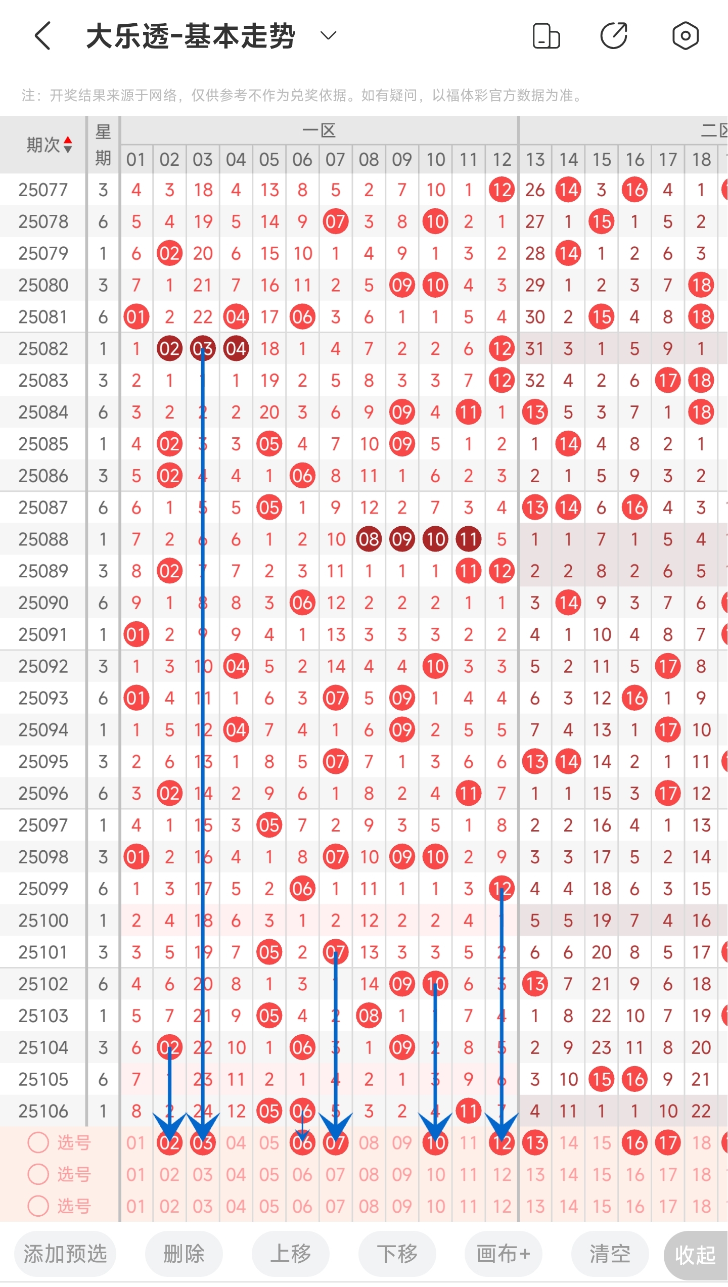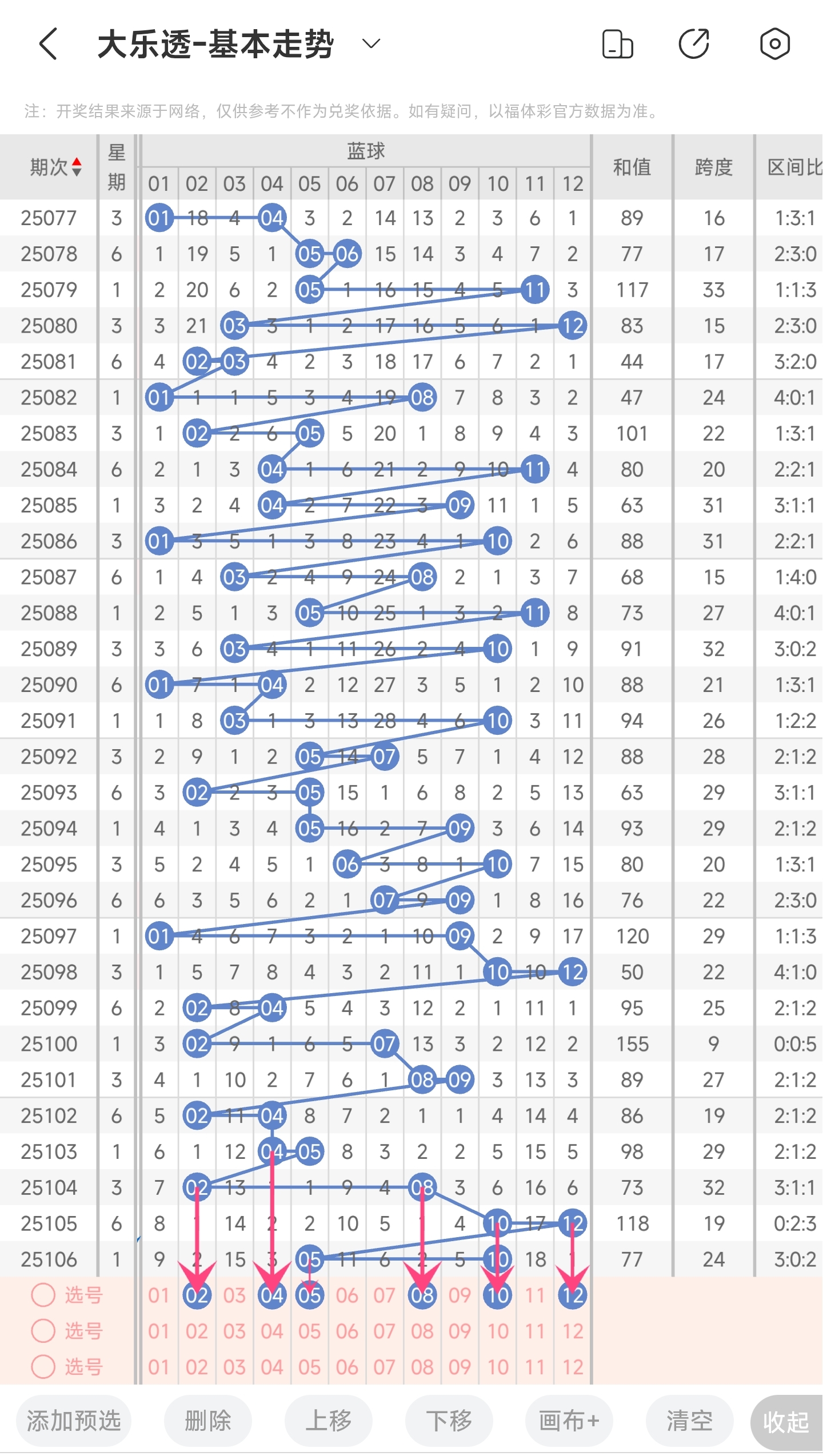 上期开出的是0510。往前一期开出1012。通过分析蓝区走势图,0510都是比较热门的号码,本期我们可以考虑一下连出的可能性。除此之外我们可以看到蓝区开出的号码跨度大多数情况下基本遵循一大一小这样子开。上期开跨度是大跨度,往前一期是小的跨度。所以本期的跨度是大概率是开比较小的跨度的了,因此我们关注的号码要分布均匀一点,相差跨度不要特别大。然后结合冷热号情况以及遗漏期数和跨度,本期我们可以关注020405081012等号。综上所述本期我们推测可能开出020405081012等号码。