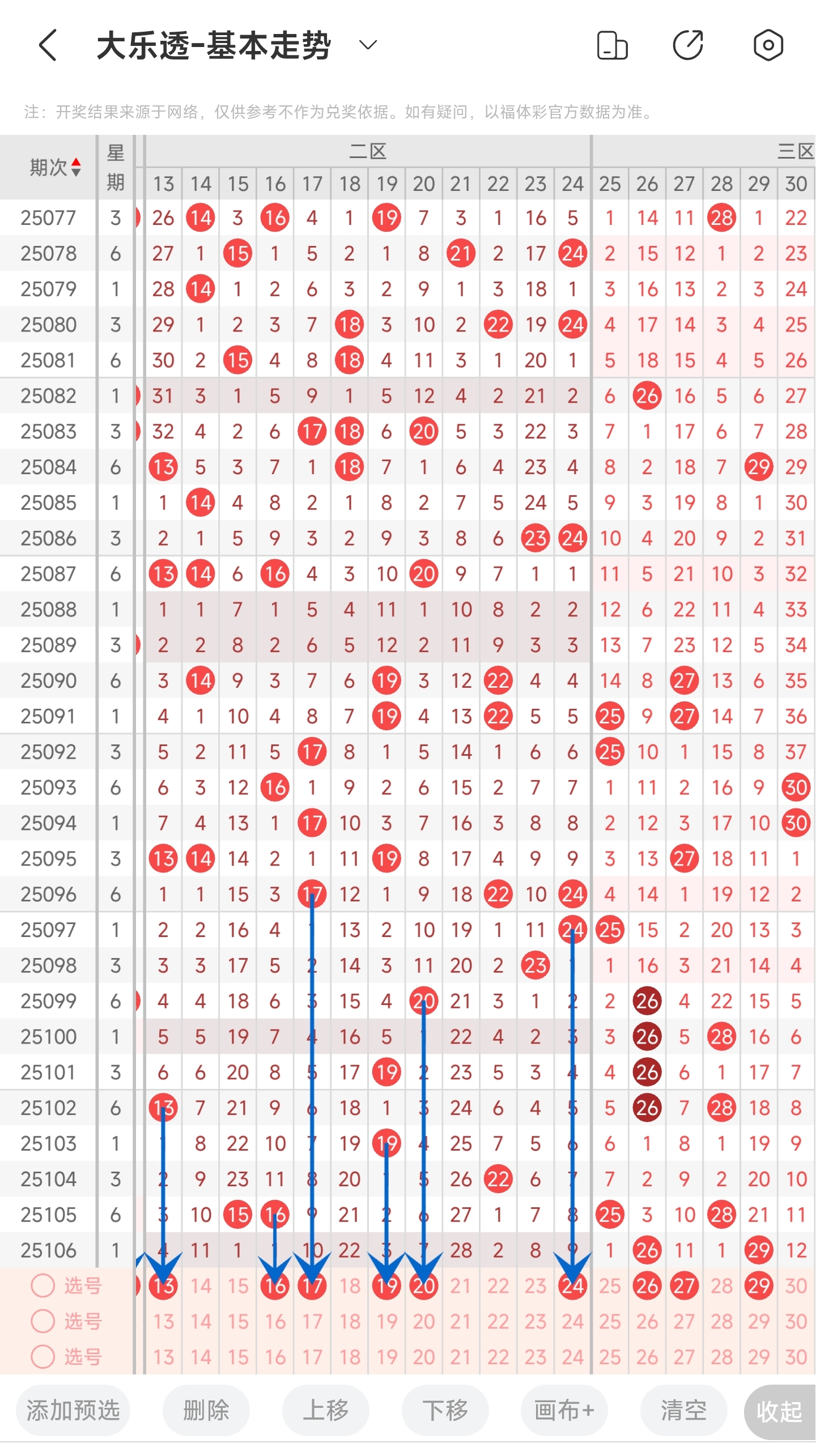 上一期开出没有开出数字。往前一期开出了1516。通过分析走势图,可以看到上期没有开出数字,所以本期有较大概率会进行回补,但又因为最近二区比较冷门,所以回补的数字可能为一两个或者还继续比较冷。所以本期我们只能结合遗漏情况和冷热号,关注一些比较热门和遗漏比较久的号码,有131617192024等号。综上所述我们可以推测本期可能会开出有131617192024等号码。