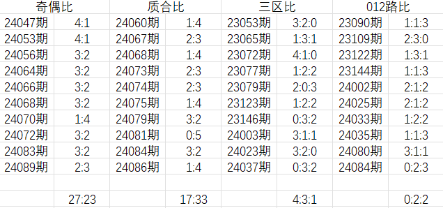 2024090期奇偶比为2:3、质合比为2:3、三区比为3:0:2、012路比3:1:1