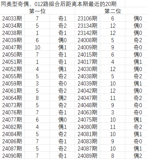 将上期蓝球号码7、11的奇偶、012路分类组合起来,也就是奇1路、奇2路,然后找到历史上最近20期第一位出过【奇1路】号码的下一期号码及类型组合、历史上最近20期第二位出过【奇2路】号码的下一期号码及类型组合,如上图所示。