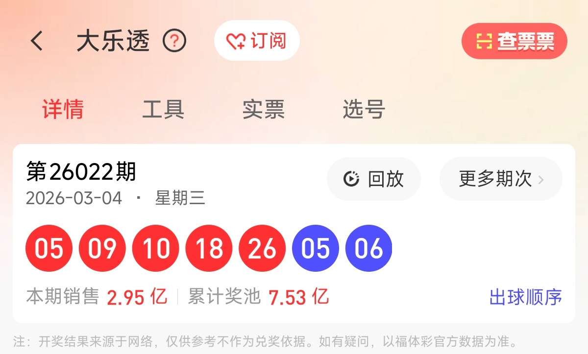 首先让我们回顾一下上期大乐透26022期的开奖为05、09、10、18、26,蓝球05、06。前区和值68,前区跨度21,区间比为3:1:1,奇偶比为2:3。