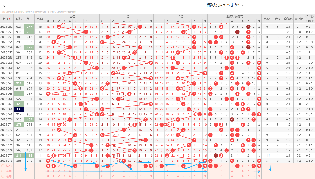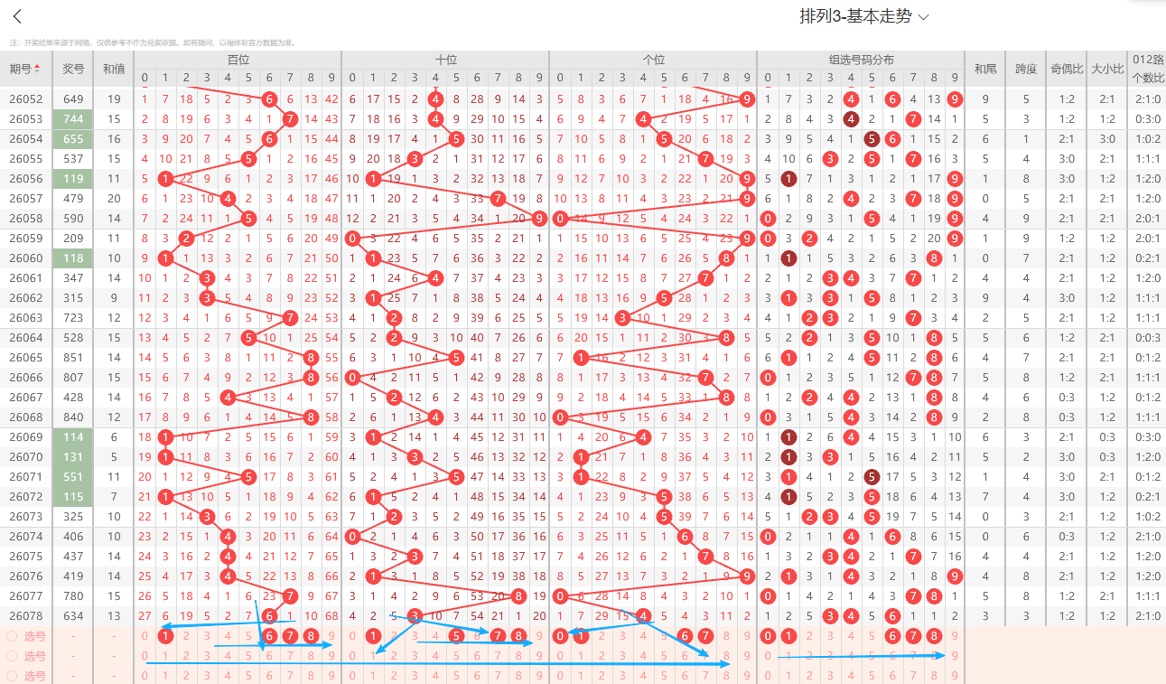 ①百位:上期开出数0号,在历史开奖记录中显示一般正常的奇偶周期平均在1~3期为普遍现象,上期出现奇偶互变开出偶数0路号码依据奇偶以及012路周期性规律的转变特征点即本期2路号码有开出的趋势0路号码注意预防