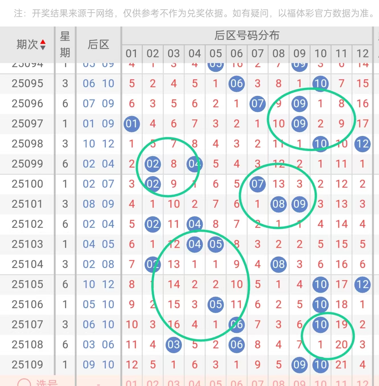 连号组合的低概率性:后区09和10是连续数字,同时开出的概率较低。从历史数据看,后区连号组合(如09-10)的出现次数极少,500期中仅出现6次左右(例如2025109期、2024120期等)。这种组合的概率约为1.2%,远低于非连号组合。排除09和10可以避免小概率事件,提高号码的分散度。