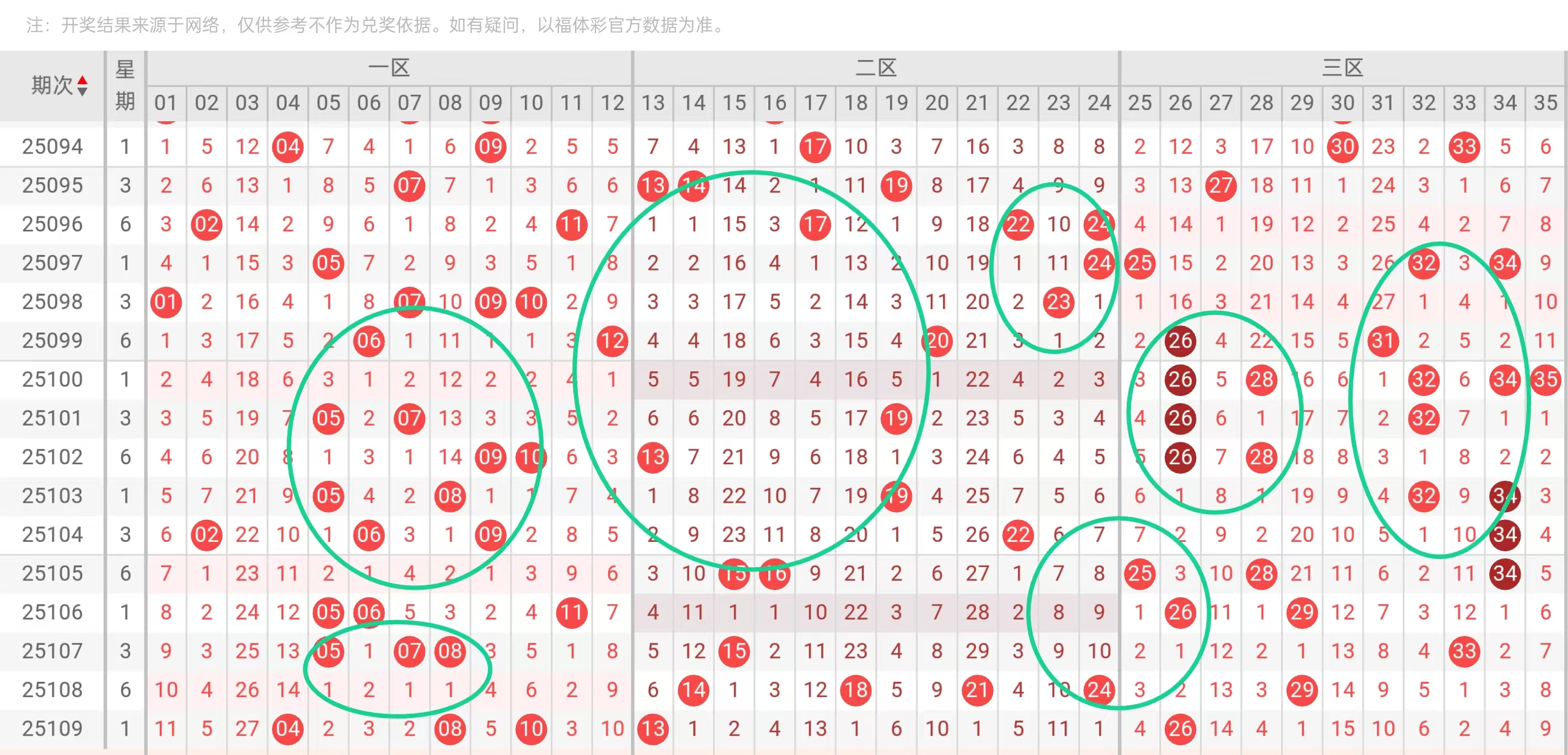 频率与遗漏分析:号码09和10的整体出现频率较高(各出现约85次),但它们的同时出现具有偶然性。此外,09的遗漏值常短期波动(如2024年第100期至2025年第50期,09遗漏超过15期),而10则经常密集出现。这种不稳定性使得排除它们成为谨慎之举,以减少对偶然性组合的依赖。