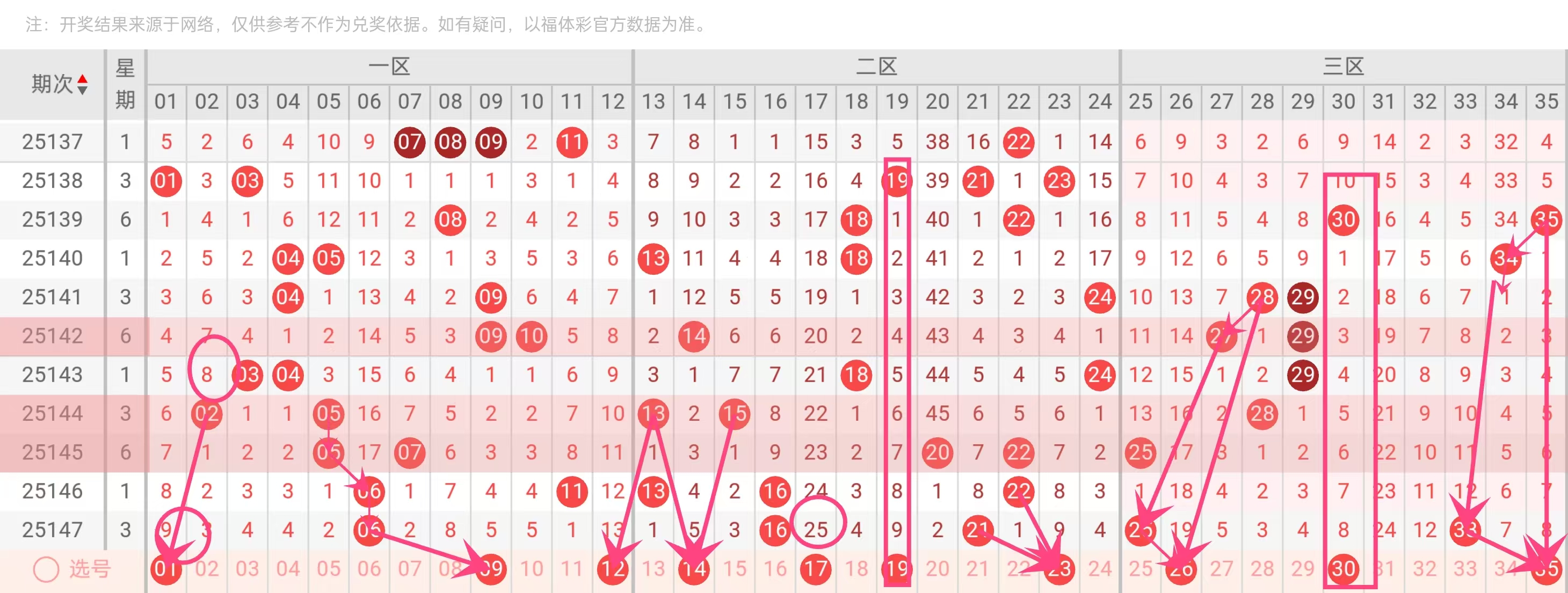二区(13-24):当前活跃区域,但14、19、23等号在近10期仅出现1-2次,属于区间内相对冷点,具备开出可能。
