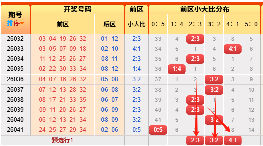 上期前区小大比0:5。言归正传我们继续用历史数据说话,前区小大比分成6种0:5、1:4、2:3、3:2、4:1、5:0(如图),我统计了一下历史出现次数,0:5出现108次、1:4出现520次、2:3出现989次、3:2出现826次、4:1出现359次,5:0出现57次,再看近10期小大比出现次数比为1:1:4:3:1:0,通过历史数据对比观察以及根据遗漏对称理论原则,故本期我们选择2:3、3:2、4:1;(具体精准方向请查看小车小大比精选)