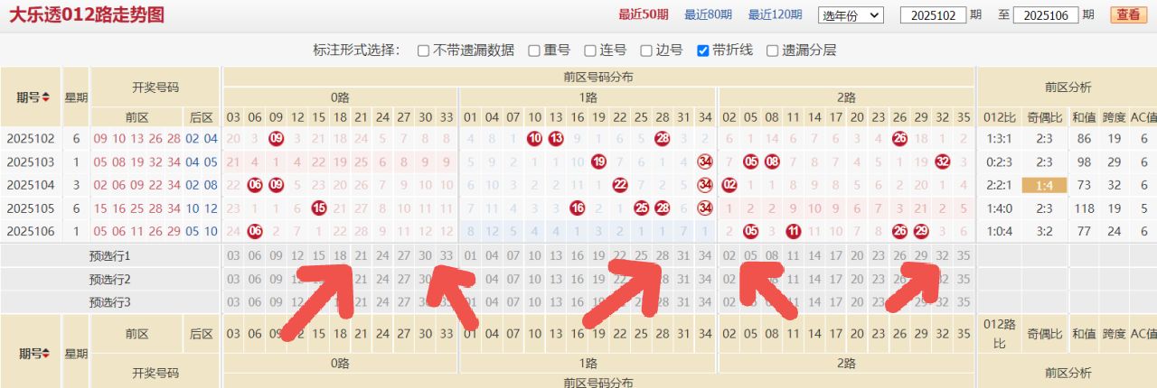 第二点在本期的奇数,偶数对比参照上。我们发现竞技大乐透的比飘动幅度不大。那么考虑到本期更重要的阐述内容可能去体现在热度恢复上。也不会在极端奇偶比这一块造成太大的难度。因此考量当下的奇数与偶数的对照关系。最大概率还是会处于一个波动不大的点,推荐本期的奇数偶数比例为32/23。