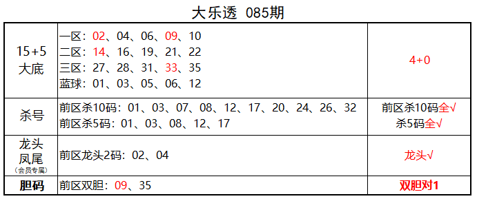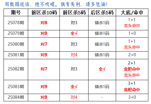 上期前区杀10码全对,杀5码全对,后区错杀,龙头命中,双胆对2 ,大底命中4+0。