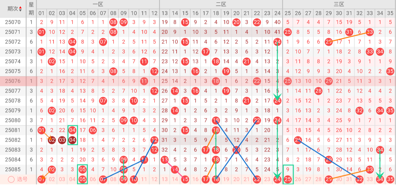 三区(25-35)分析:上期该区开出号码33,近10期占比20%,与上期相比无变化。本期无三斜连号趋势,隔码斜连走势:32。本区近期明显弱势,连续5期出号量不超过1枚,处于历史低谷。均值0.8枚,低于理论值43%。本期可能稳定出号1枚。推荐关注号码:25、29、32、34、35。