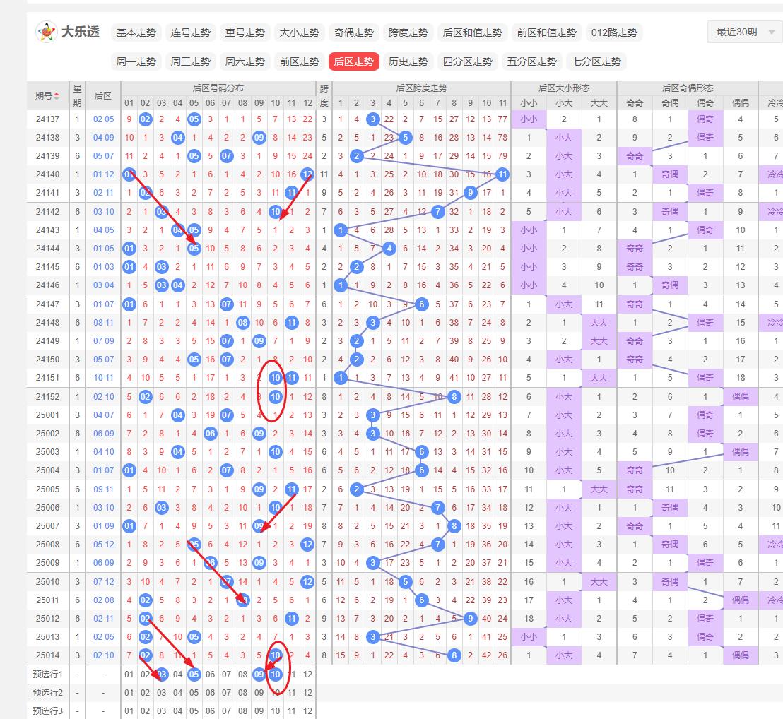 - 一区(1-12):近50期出号率18%,冷号03(遗漏17期)、09(遗漏15期)触发回补信号,热号07、11(近5期高频)需防断档,推荐2枚