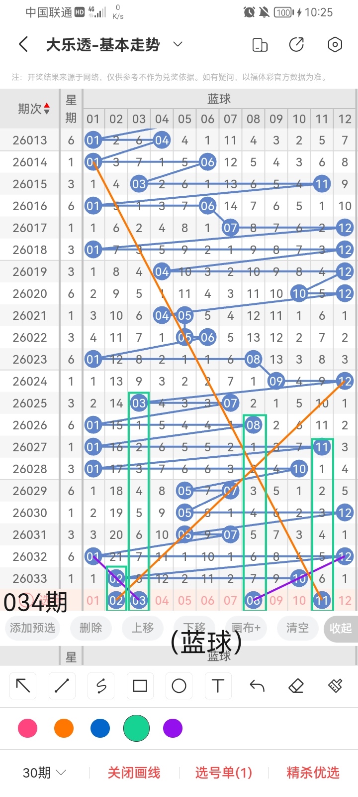 小梁根据上图中画线的思路走势分析,最后给大家汇总一下大乐透本期红球、蓝球数据,供大家参考: