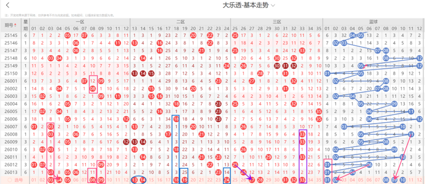 上一期后区开出01-04,后区奇偶比为1:1,大小比为0:2,质合比为1:1;本期后区需要关注的号码:01仍有可能会重出;02与04-06形成了斜连走势;09与10-11形成了斜连走势;09可能会与08或10一起落号;因此本期后区看好01-02-08-09-10等号码。