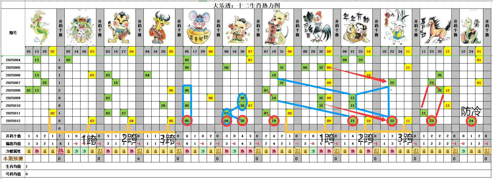 猪肖属于温偏热生肖,近期热力连续上升,根据上图蓝色椭圆圈和羁绊线可知,该肖的两个红球热码06和30应该尚有作为,因此本期需防红球06 30