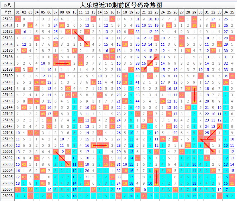 大乐透近30期前区号码冷热图(数字为遗漏期数,蓝色标记的为遗漏超过10期的大冷号)