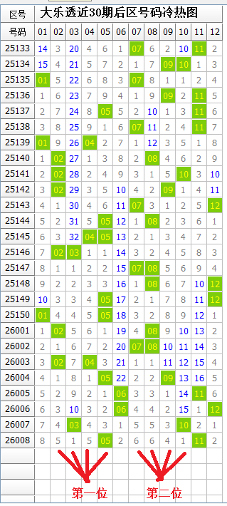 大乐透近30期后区号码冷热图(数字为遗漏期数,蓝色标记的为遗漏超过10期的大冷号)