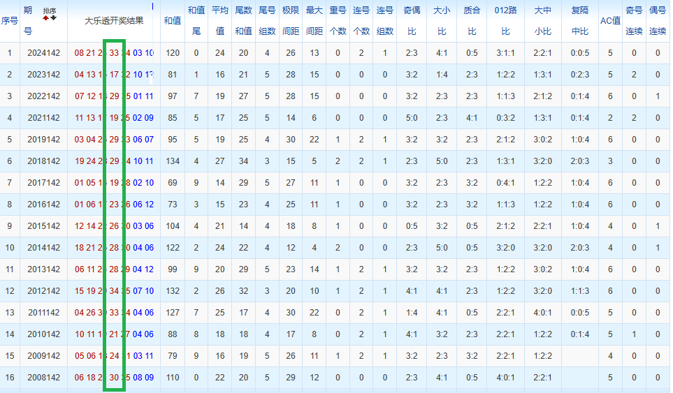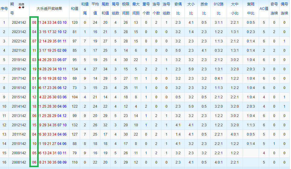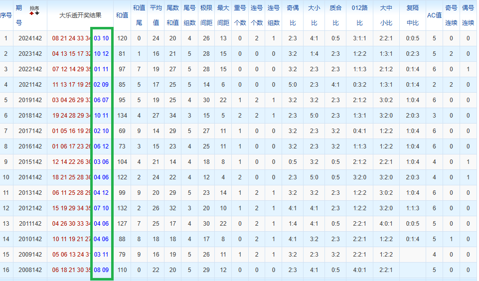 通过观察,我发现往年同期的开奖数据与本期号码之间存在显著关联。具体来说,在前区号码中,从第一位至第五位,通常会有约三个位置上的数字与往年同期相同位置的号码一致;而后区号码中,也有多期开奖结果直接包含了往年同期的数字。因此,我们可以借助往年同期各位置上的号码,作为分析本期开奖情况的重要依据。在此基础上,还可结合往年同期的其他相关条件,进行综合性的号码组合推荐。